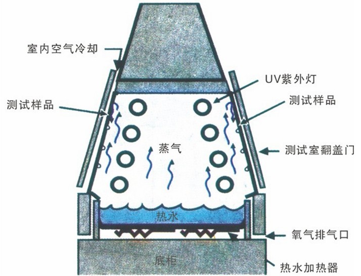 6.水槽溫度采用彩色觸摸屏程序韓國溫控儀控制加熱,水槽位于箱體下部,內(nèi)置電加熱水器。在測試過程中,有一個測試段是黑暗凝露過程,它需要箱體內(nèi)能產(chǎn)生較高溫度的飽和水蒸氣,當(dāng)水蒸氣遇到相對較冷的樣板表面時,會在樣板表面凝結(jié)露水。