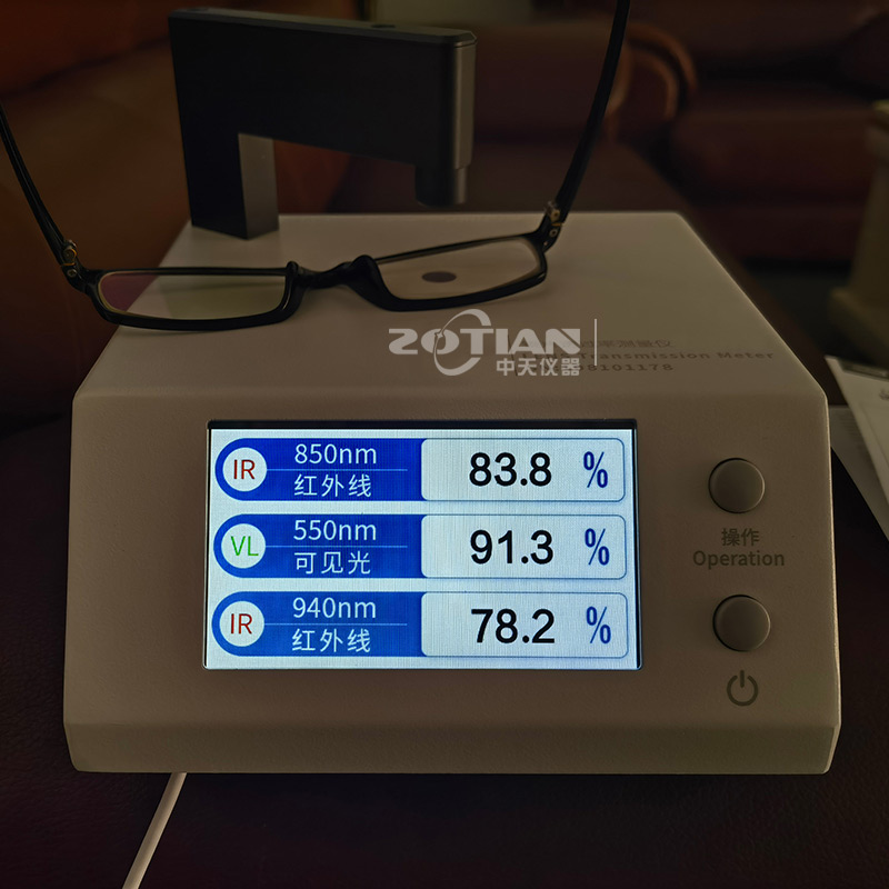 OT-850B鏡片透過率測試儀的測試原理是采用紅外850nm光源,紅外940nm光源和可見550nm光源照射被測透明物質,感應器分別探測三種光源的入射光強和透過被測透明物質后的光強,透過光強與入射光強的比值即為透過率,用百分數表示。