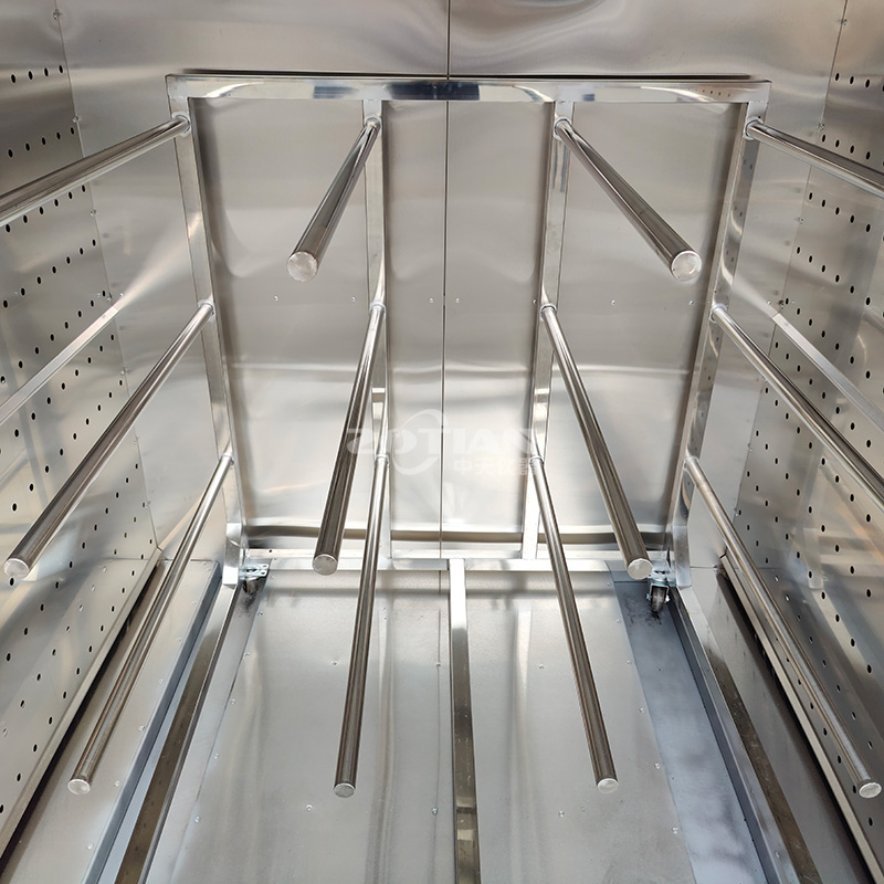 外形采用 1.5mm 厚冷板折彎焊接而成,表面噴電腦白工業(yè)漆(非普通油漆),防生銹,外形尺寸:寬 1600mm,深 830mm,高 1860mm,雙開門, 配加強(qiáng)型不銹鋼門鎖,拉手。底部配可移動剎車腳輪,方便烤箱移動固定。